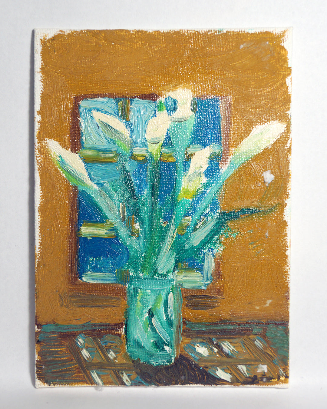 A playful approach to a bouquet of cala lilies. This still life focuses on the varying hues of blues that go along with the browns of the background. The window in the back gives the painting more perspective that catches your attention.