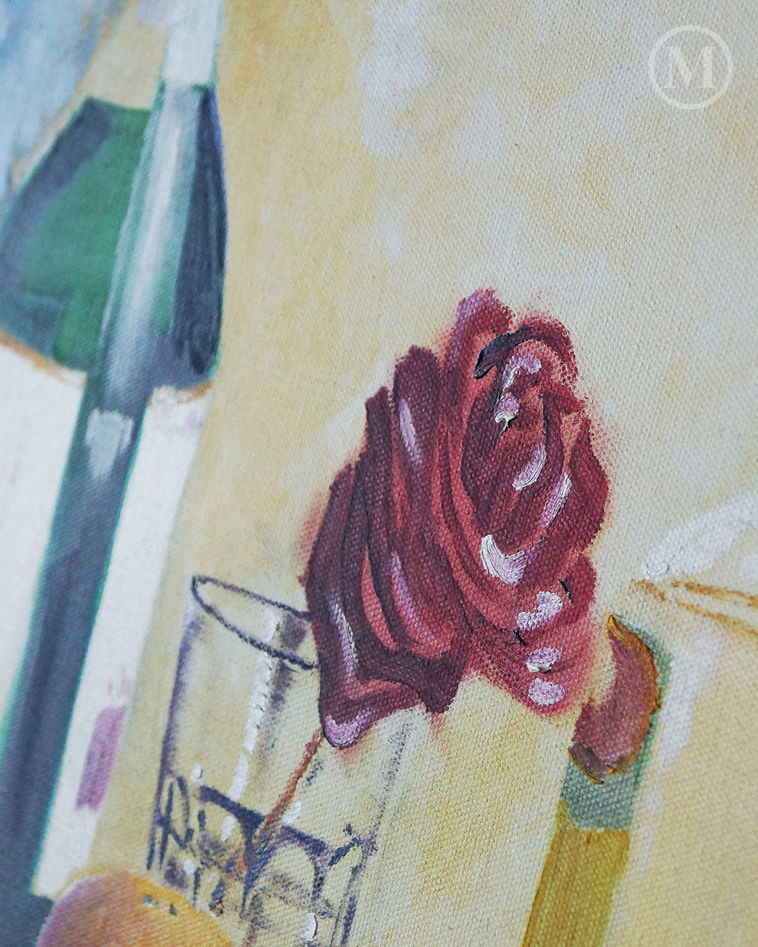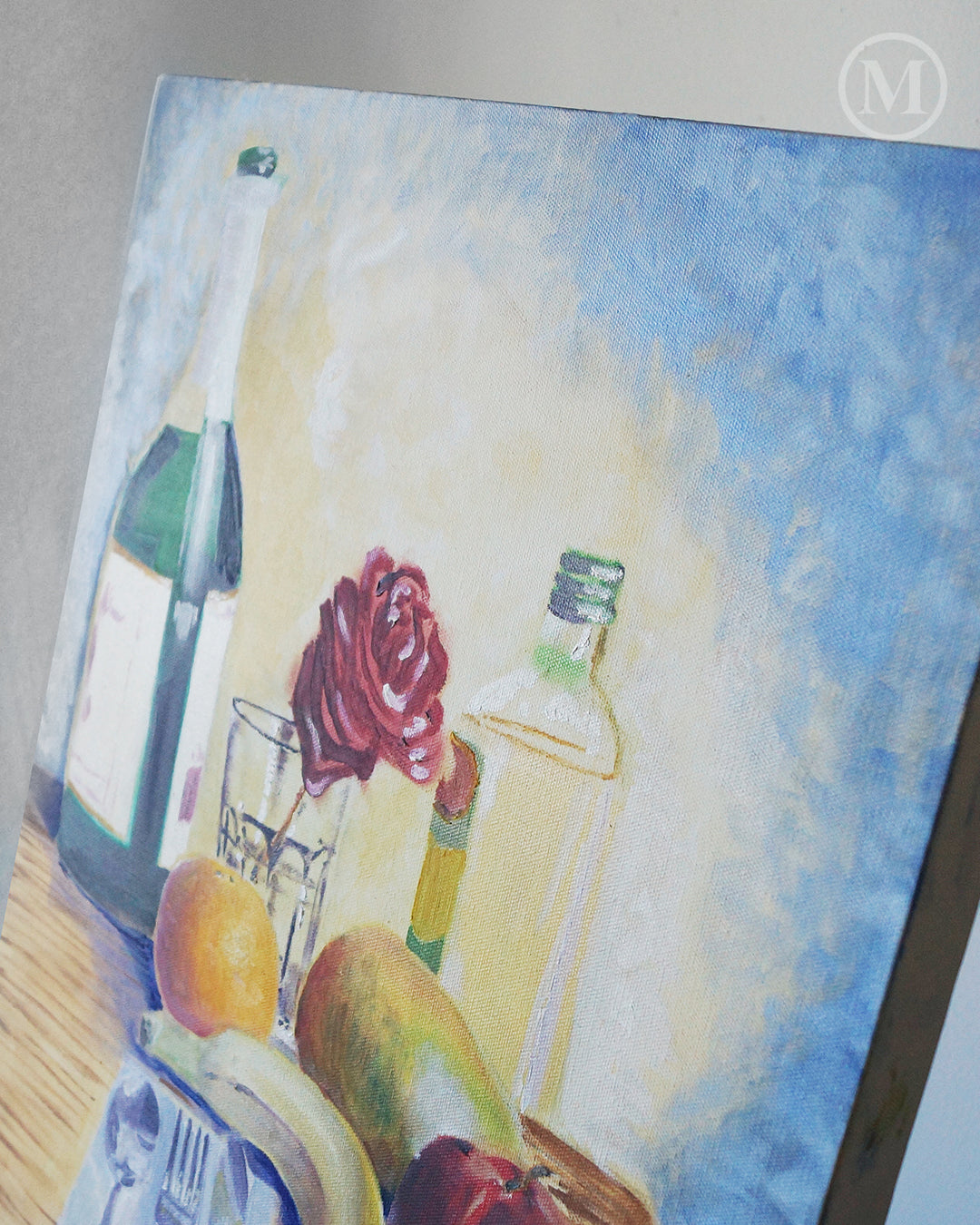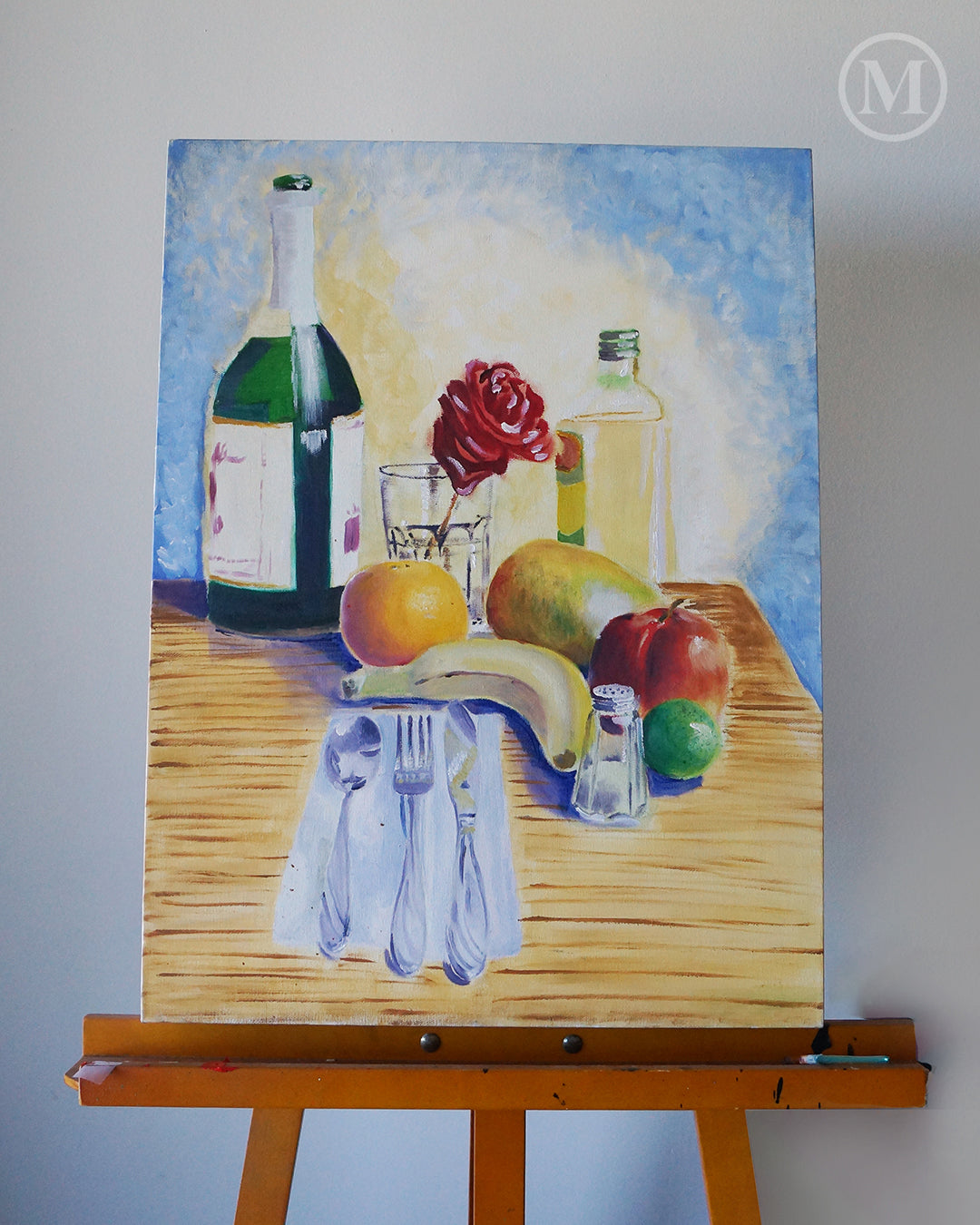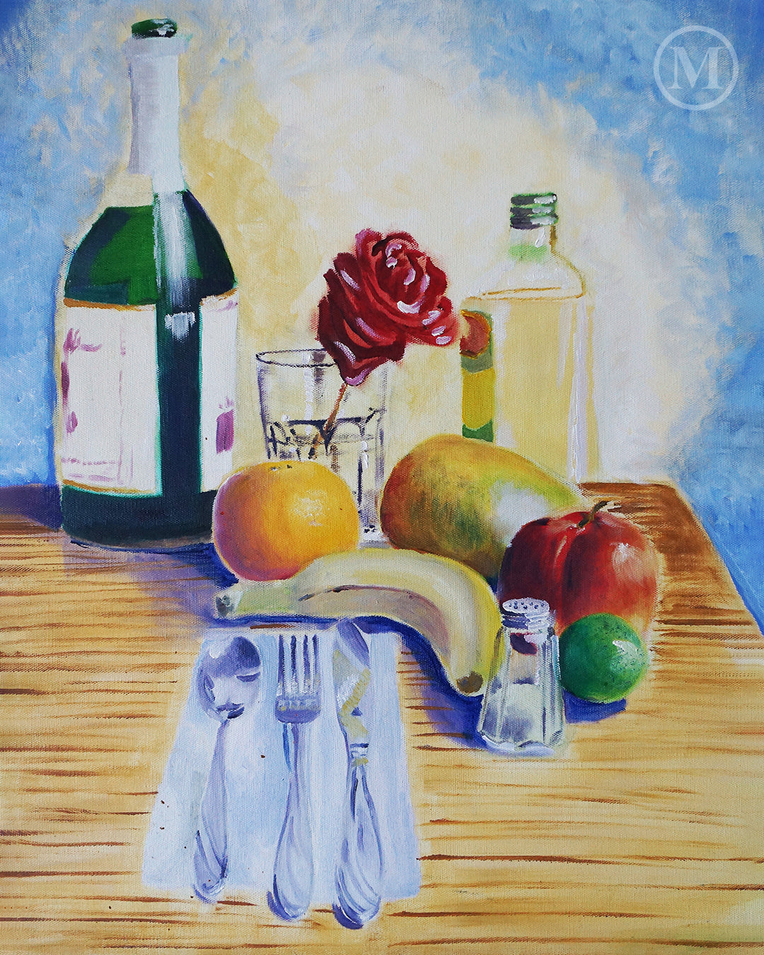 The kitchen table sees all sorts of family activity and is essential in preparing those family dinners. A more realistic approach was taken for that reason with light strokes and carefully placed highlights. Silverware, fruits, olive oil, a bottle of cider, and a little salt shaker create a tight composition that creates harmony. To top it off a rose is added to the center to tie it all together.